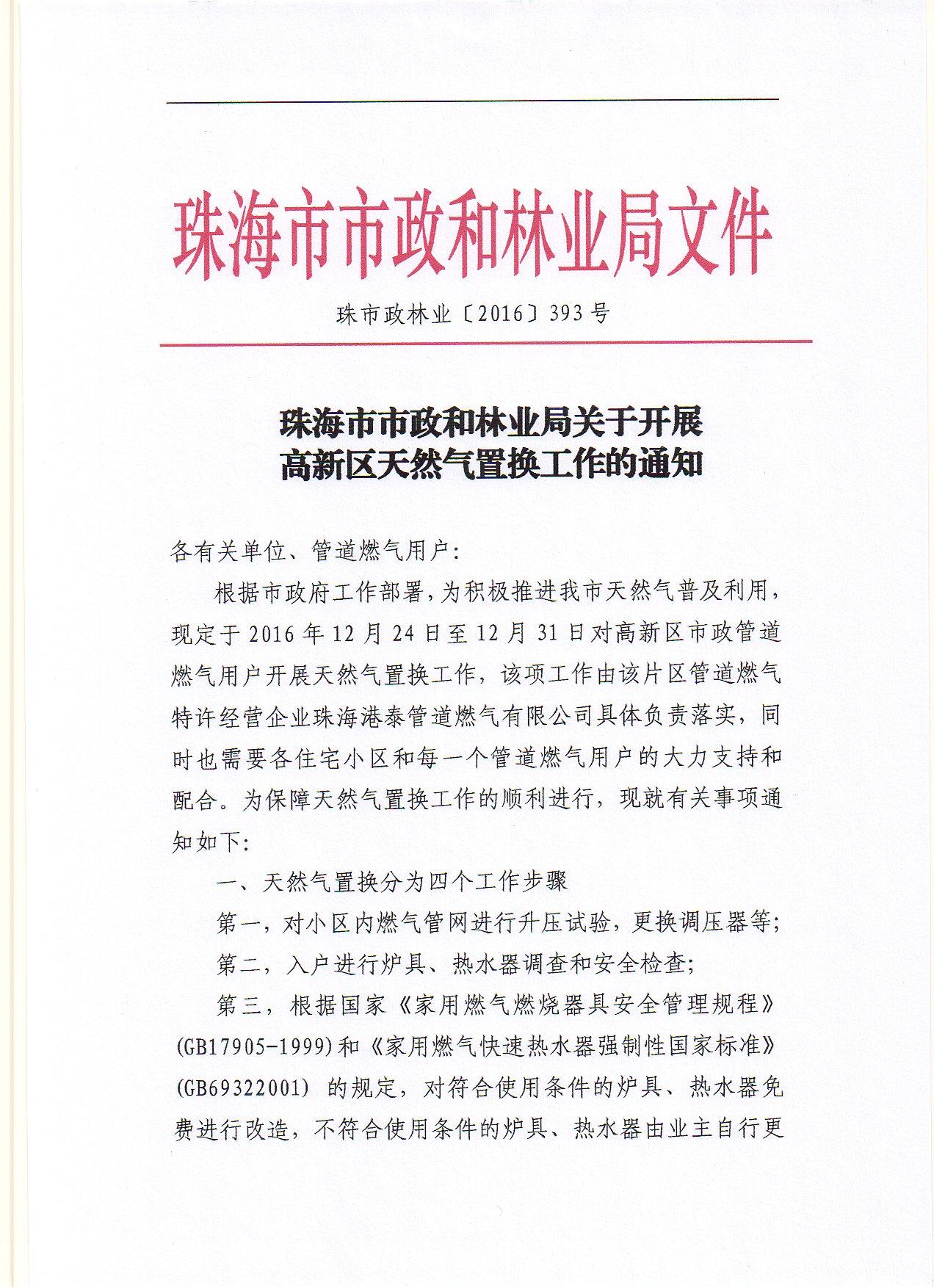 珠海市市政和林業(yè)局關于開展高新區(qū)天然氣置換工作的通知