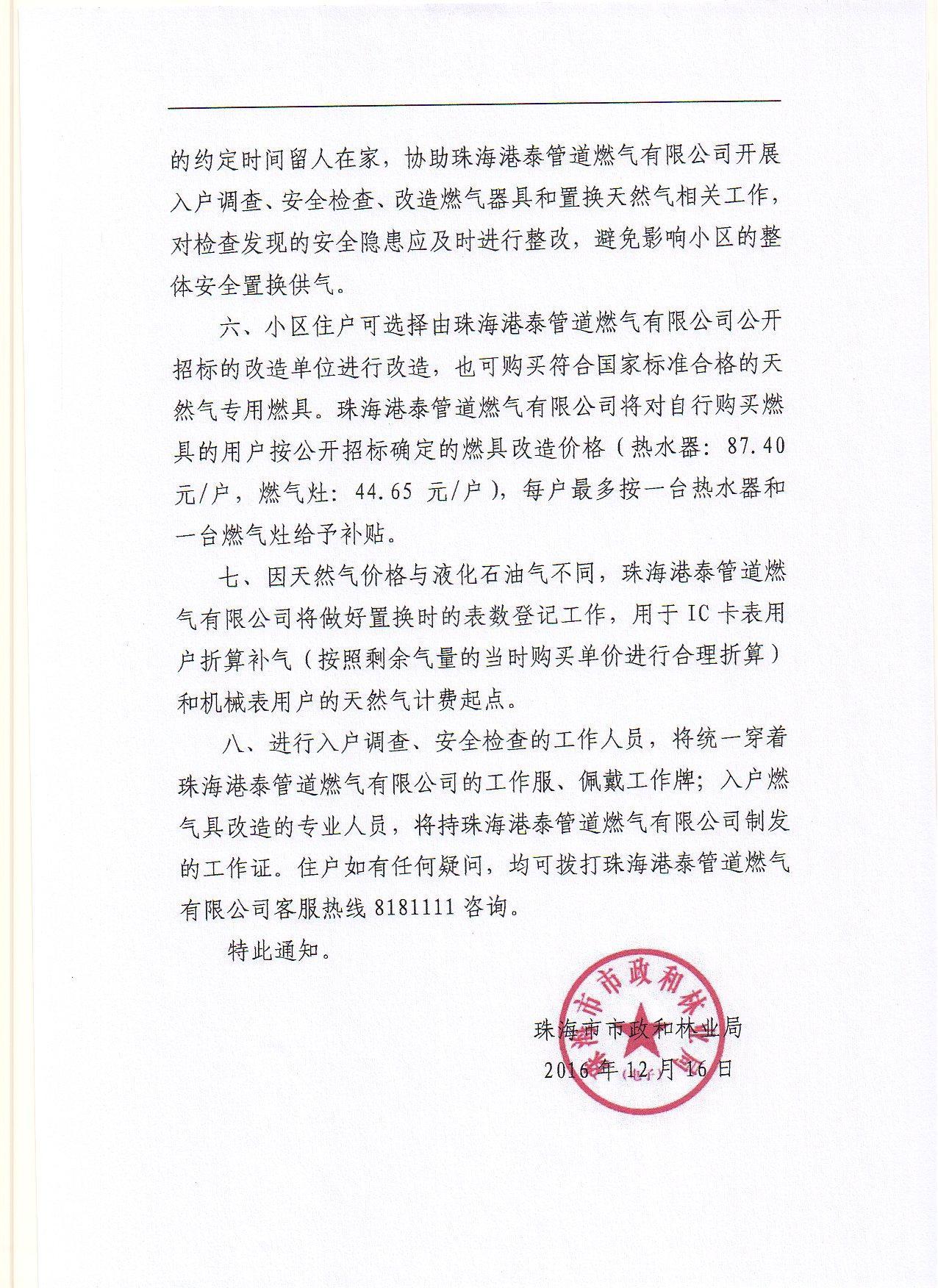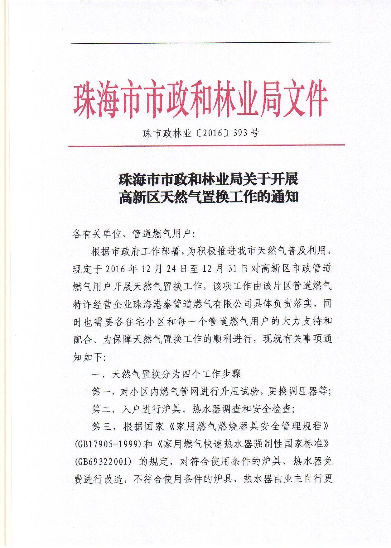 珠海市市政和林業(yè)局關(guān)于開展高新區(qū)天然氣置換工作的通知
