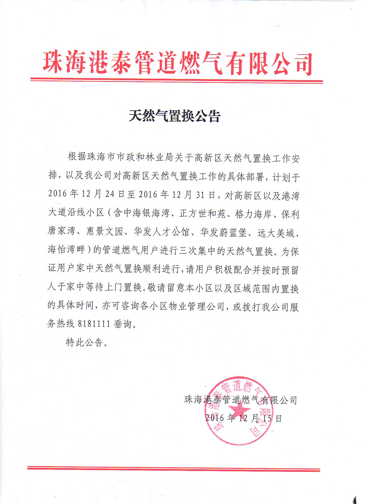 根據(jù)珠海市市政和林業(yè)局關(guān)于高新區(qū)天然氣置換工作安排,以及我公司對高新區(qū)天然氣置換工作的具體部署,計劃于2016年12月24日至2016年12月31日,對高新區(qū)以及港灣大道沿線小區(qū)(含中海銀海灣、正方世和苑、格力海岸、保利唐家灣、惠景文園、華發(fā)人才公館、華發(fā)蔚藍(lán)堡、遠(yuǎn)大美域、海怡灣畔)的管道燃?xì)庥脩暨M(jìn)行三次集中的天然氣置換。為保證用戶家中天然氣置換順利進(jìn)行,請用戶積極配合并按時預(yù)留人于家中等待上門置換。敬請留意本小區(qū)以及區(qū)域范圍內(nèi)置換的具體時間,亦可咨詢各小區(qū)物業(yè)管理公司,或撥打我公司服務(wù)熱線8181111垂詢。
