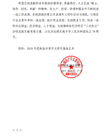 珠海港泰燃?xì)馇吧絻ε湔鞠搏@2018年度珠海市“青年文明號”榮譽稱號
