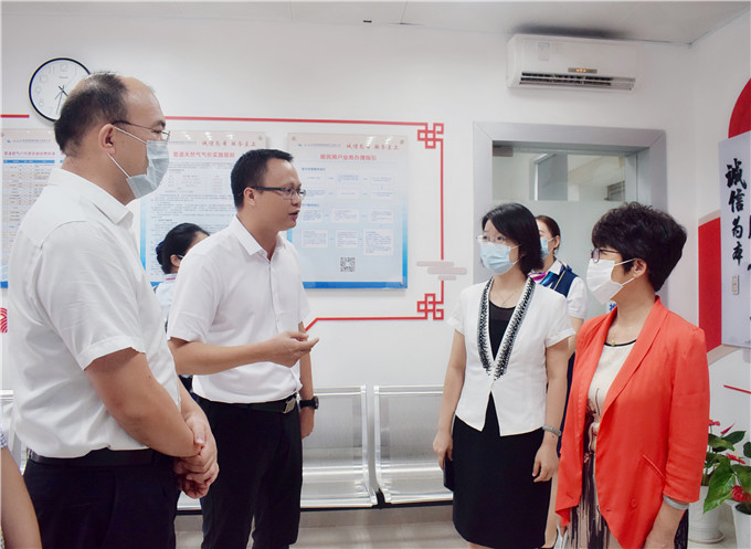圖說(shuō):王小勤副部長(zhǎng)、陳萍副主任、徐海東總工程師到港泰燃?xì)鉅I(yíng)業(yè)廳現(xiàn)場(chǎng)指導(dǎo)工作