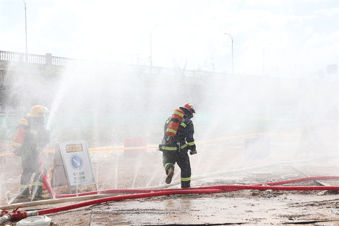 圖說(shuō):消防員對(duì)泄漏點(diǎn)噴淋滅火。