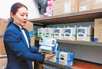 工作人員展示經(jīng)國(guó)家強(qiáng)制檢定合格,用于市民家庭的智能燃?xì)獗怼?