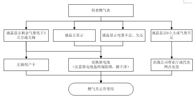 c、機(jī)械表用戶檢查是否有欠費(fèi)停氣,欠費(fèi)用戶需到我公司營業(yè)廳繳交清所欠費(fèi)用,方可恢復(fù)供氣。