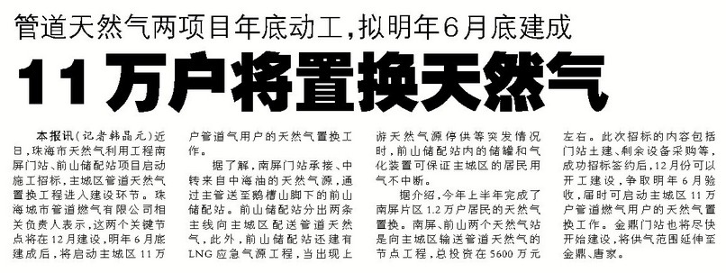 本報(bào)訊(記者韓晶元)近日,珠海市天然氣利用工程南屏門站、前山儲(chǔ)配站項(xiàng)目啟動(dòng)施工招標(biāo),主城區(qū)管道天然氣置換工程進(jìn)入建設(shè)環(huán)節(jié)。珠海城市管道燃?xì)庥邢薰鞠嚓P(guān)負(fù)責(zé)人表示,這兩個(gè)關(guān)鍵節(jié)點(diǎn)將在12月建設(shè),明年6月底建成后,將啟動(dòng)主城區(qū)11萬(wàn)戶管道氣用戶的天然氣置換工作。