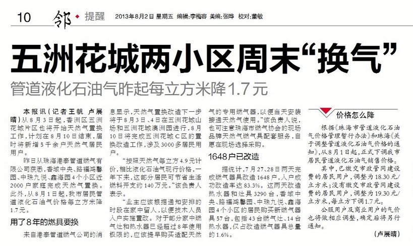 昨日從珠海港泰管道燃?xì)庥邢薰精@悉,香域中央、路福鴻馨園、中珠九悅、鑫海園4個(gè)小區(qū)近2000戶家庭完成天然氣置換。此外,從8月1日起,我市居民管道液化石油氣價(jià)格每立方米降1.7元。